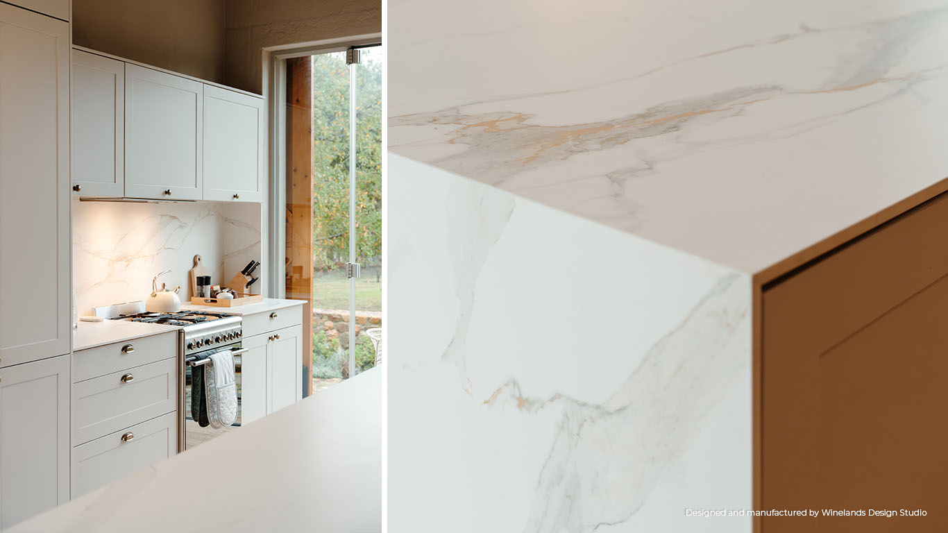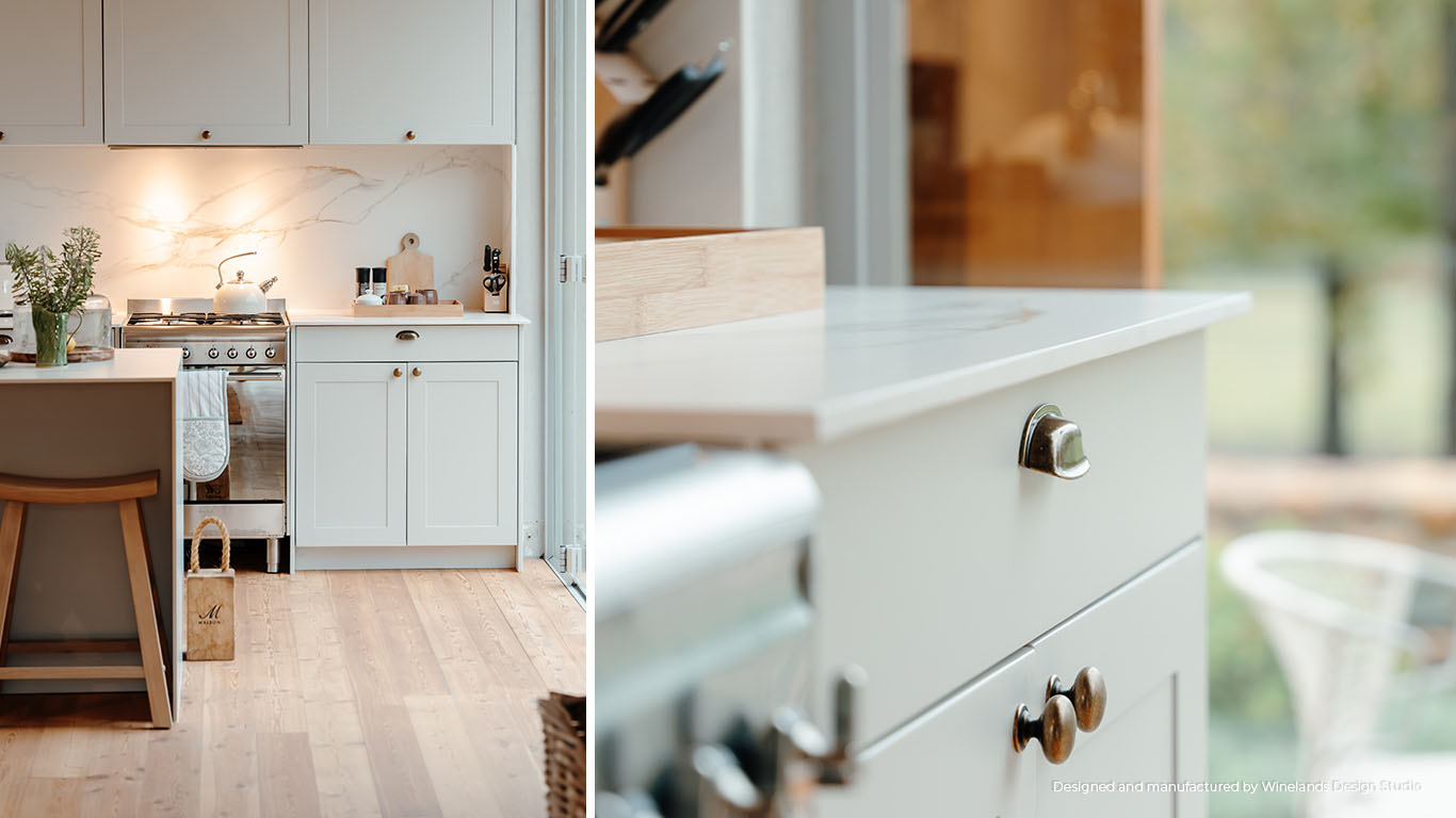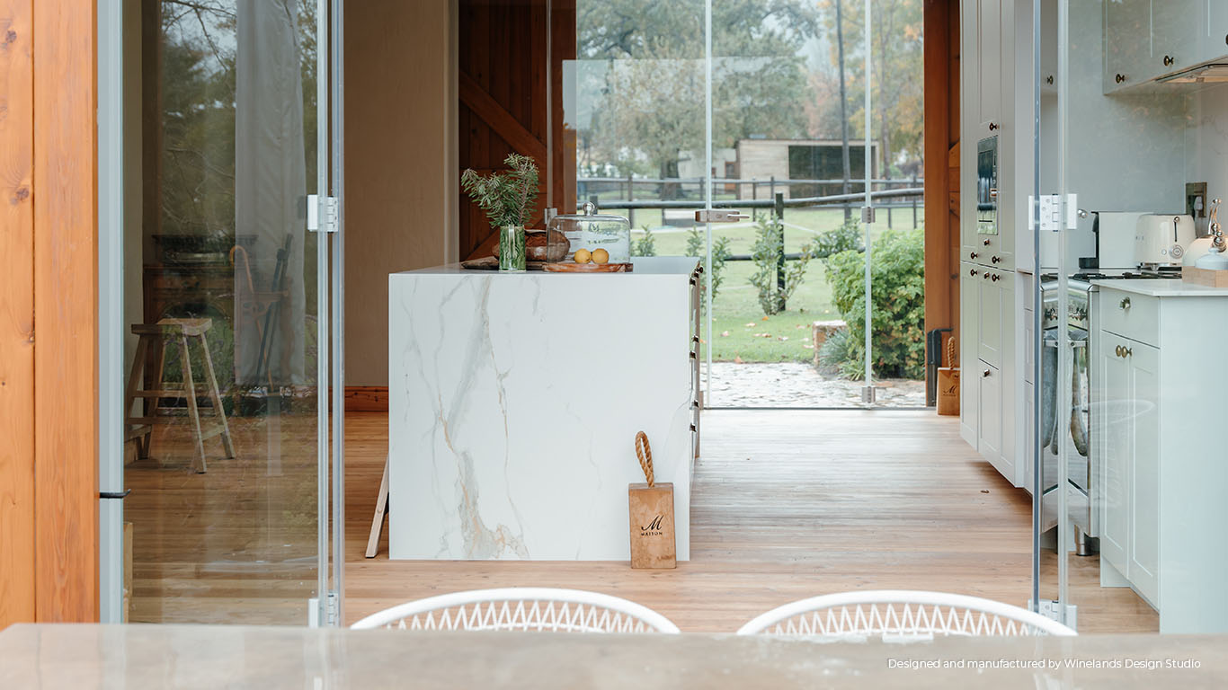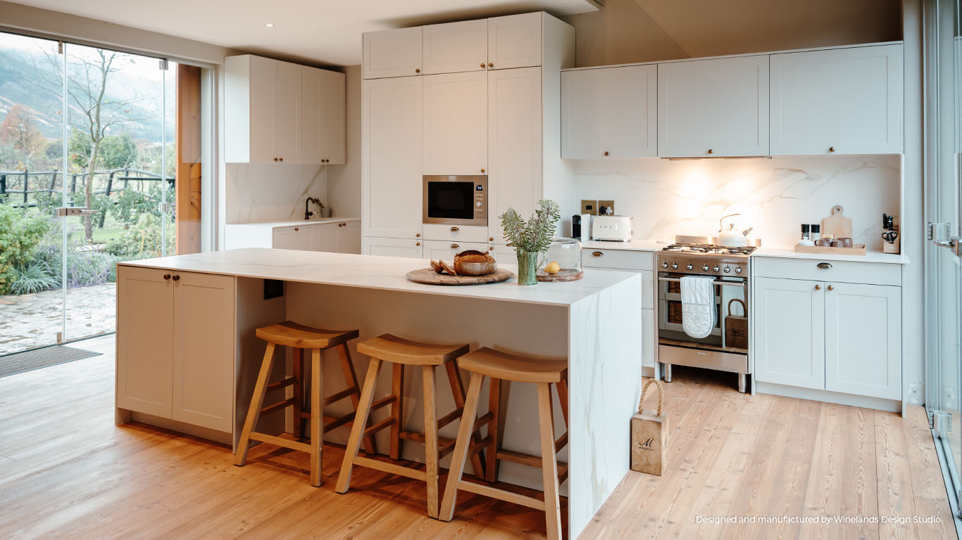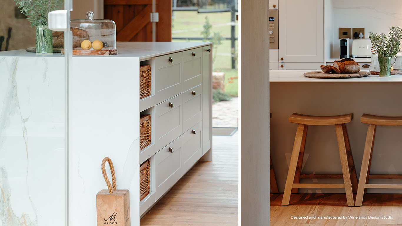 Inspired by the breathtaking landscapes surrounding the property, this Franschhoek contemporary country kitchen, modernises a classic space by using gently contrasting colours and bespoke finishes.