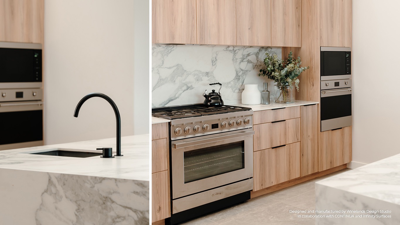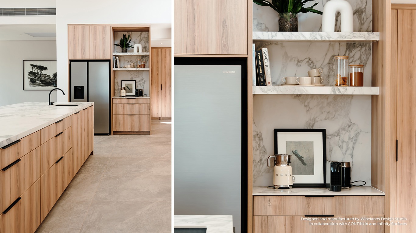 This contemporary kitchen, designed and manufactured by Winelands Design Studio modernises a classic space by using contrasting colours and finishes.
